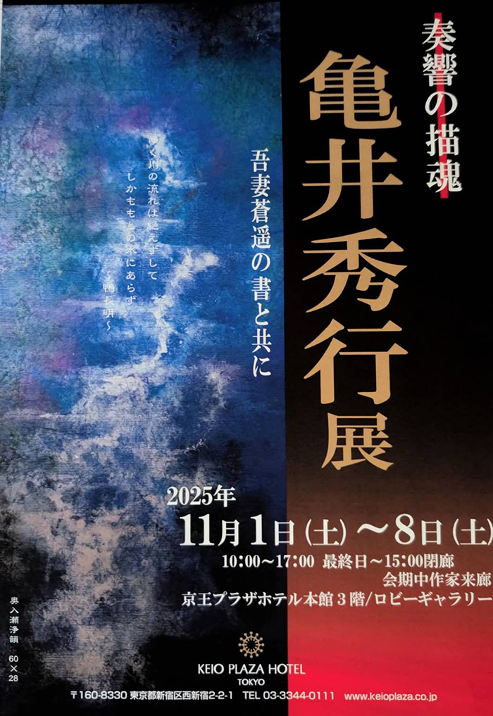 ニュース 展覧会のお知らせ 奏響の描魂 亀井秀行展 ~吾妻蒼遥の書と共に~ 2025年11月1日(土)~8日(土) 10:00~17:00 ※最終日 15:00閉廊 京王プラザホテル 本館3階/ロビーギャラリー